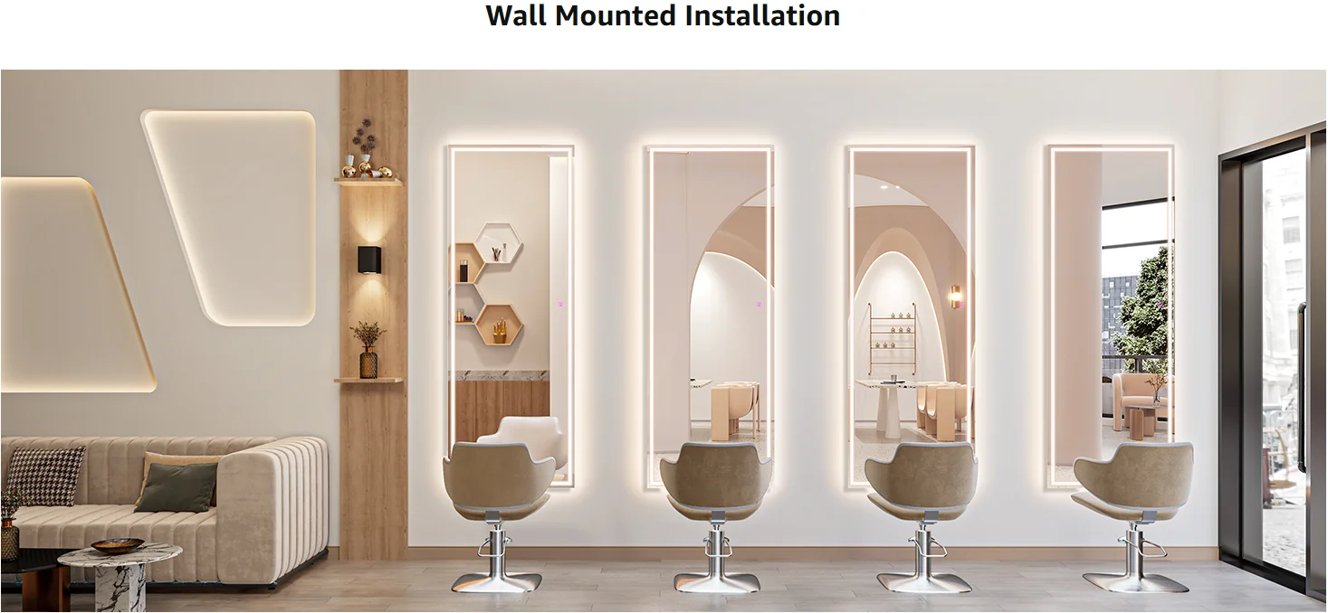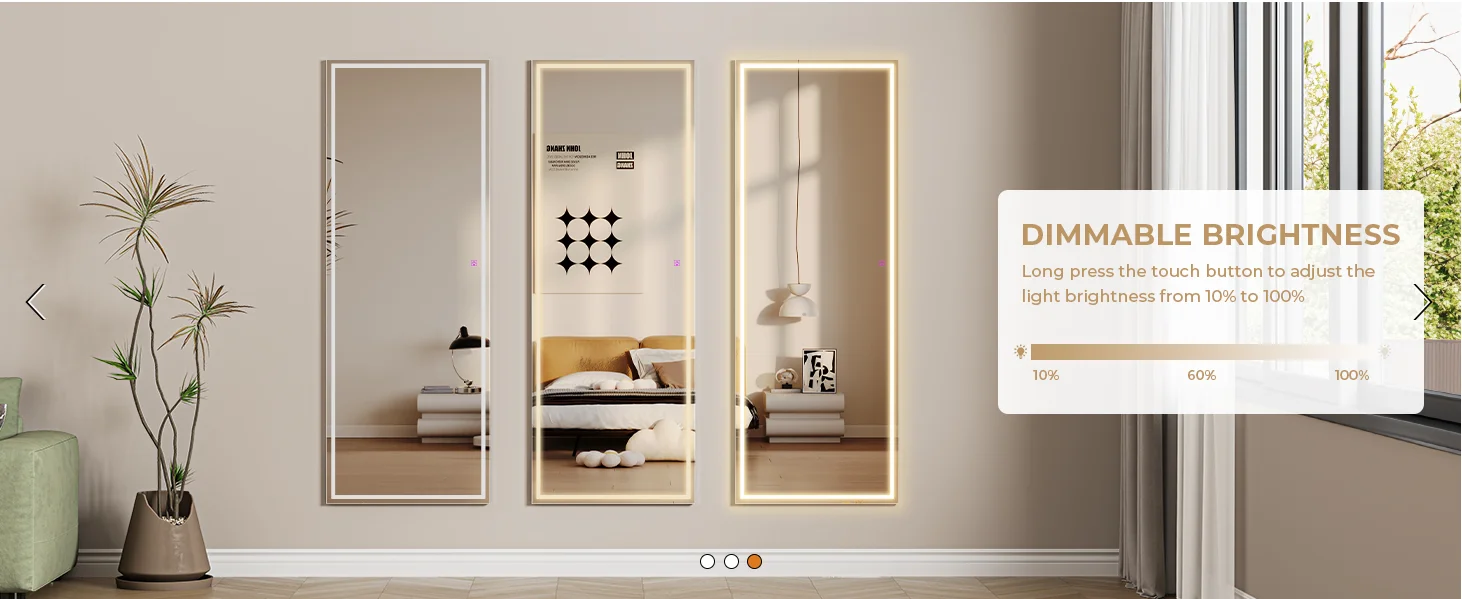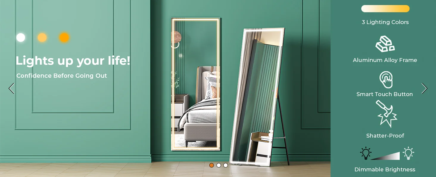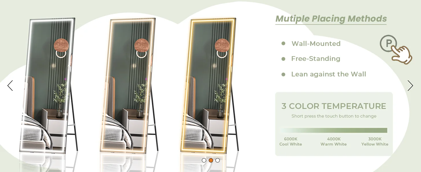【3 Color & Adjust Brightness】The brightness and light temperature of this full length mirror are controlled by a smart touch button. Short press the switch to change the color temperature into white light, warm light or yellow light. Long press the switch for seconds to adjust the brightness to your liking.